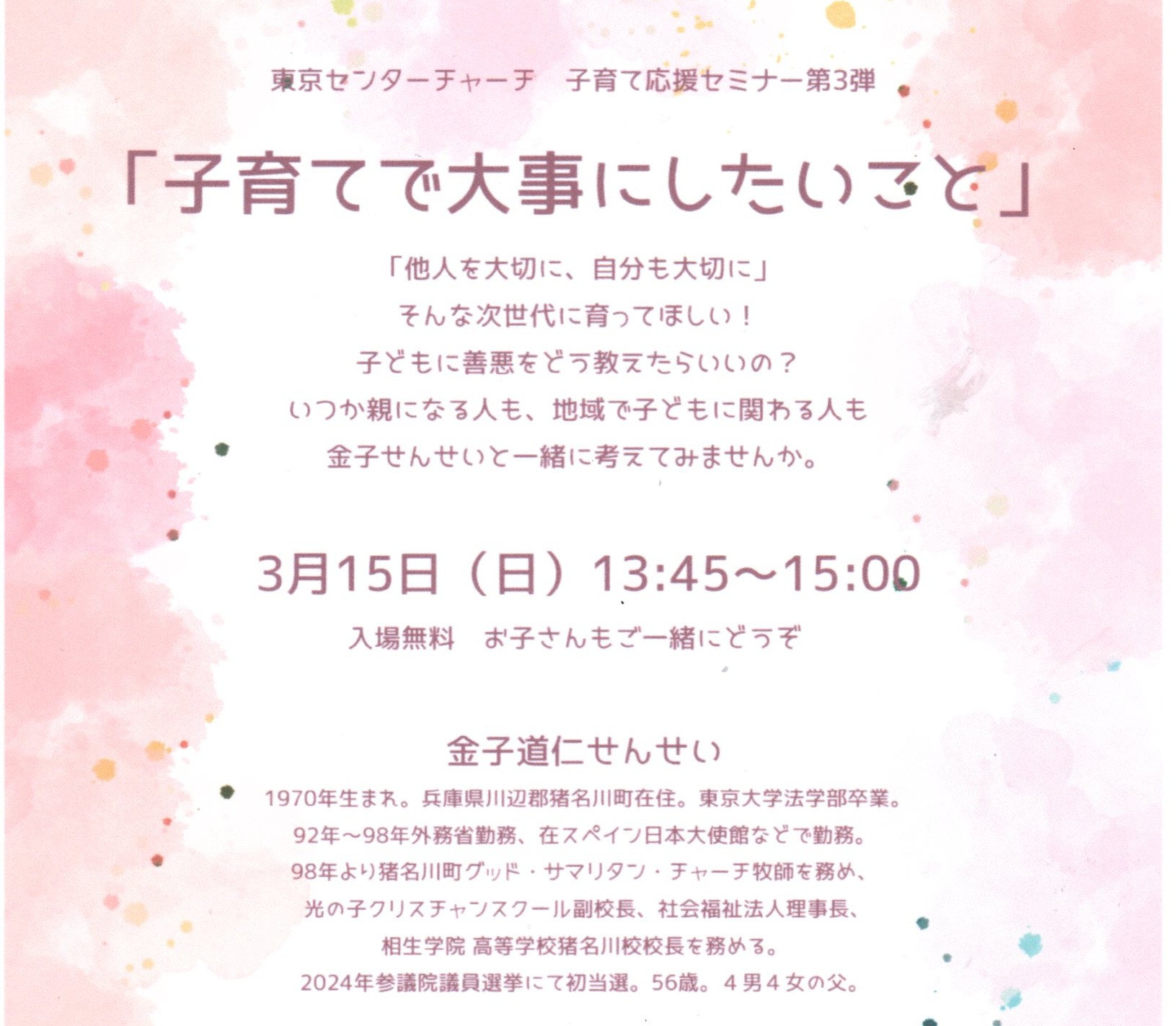 講演の前に、11時からのTCC第一礼拝で、金子せんせいに「キリスト者として社会に仕える」と題して聖書のメッセージを語って頂きます。どなたも大歓迎! 初めての方も、ぜひご出席ください。