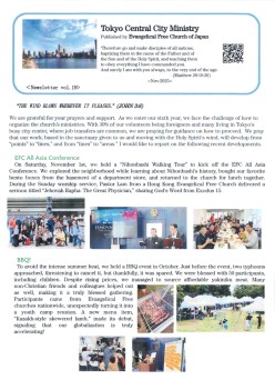 Established in April 2018, ‘Tokyo Central City Ministry’ is an official ministry of the Evangelical Free Church of Japan (EFC), with the aim of ‘leading people of all nations to Christ, raising them as disciples of Christ, and dispatching them to the world according to the Lord’s calling’ in the heart of central Tokyo.